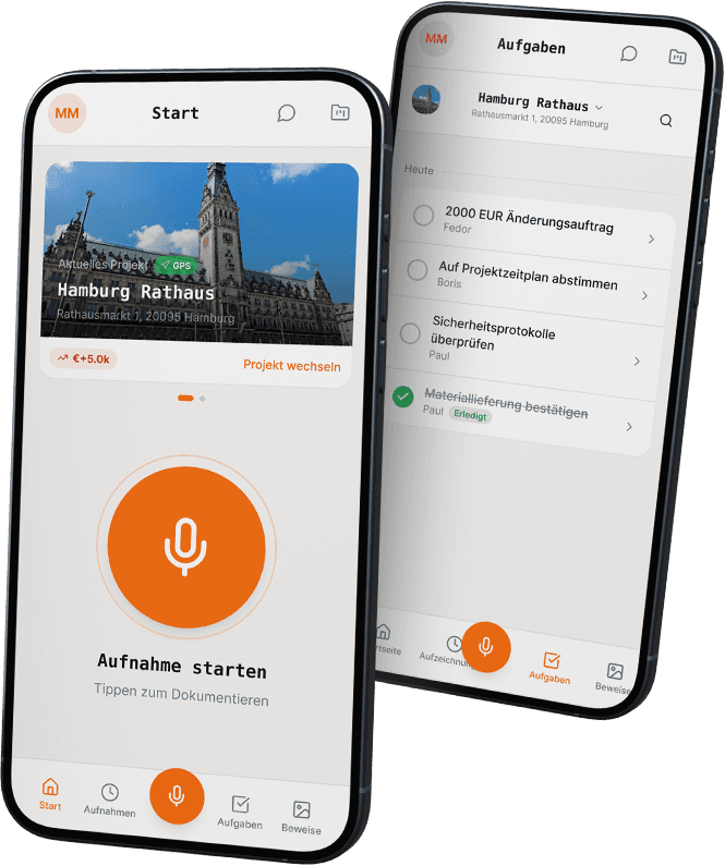 Nimm den Mangel per Sprache auf und mach ein Foto der fehlerhaften Ausführung, bevor der Estrich gegossen wird.